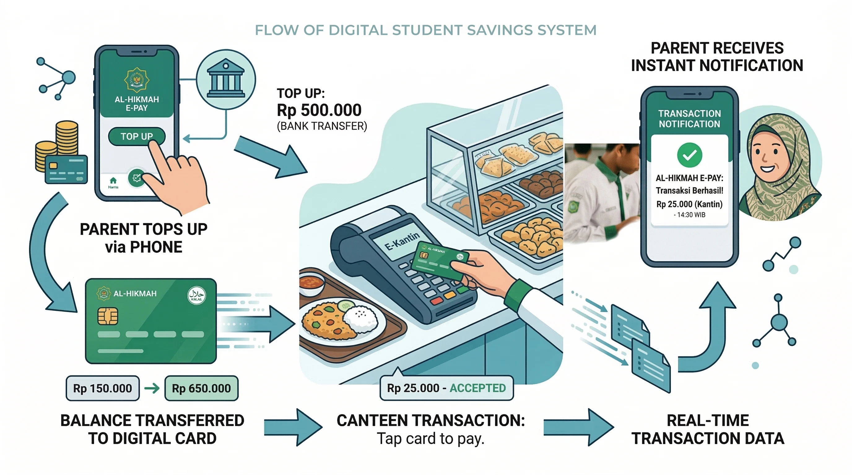Dengan alur yang jelas — orang tua top-up, santri belanja cashless, orang tua monitor — sistem ini menjawab tiga kebutuhan sekaligus: keamanan, transparansi, dan kemudahan. Bukan hanya untuk satu pihak, tapi untuk seluruh ekosistem pesantren.