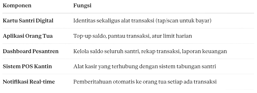 Sistem ini berbeda dari sekadar e-wallet umum karena dirancang dalam ekosistem tertutup: hanya bisa digunakan di merchant yang terdaftar di pesantren, dengan kontrol penuh dari pihak pesantren dan orang tua.