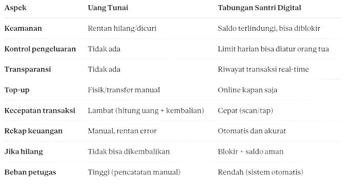 Lingkungan asrama yang padat dengan banyak penghuni adalah kondisi yang tidak ideal untuk menyimpan uang tunai dalam jumlah besar. Dompet yang tertinggal di laci, uang yang disembunyikan di buku, atau bahkan yang dipegang sendiri oleh santri — semuanya berisiko. Dan ketika uang hilang, seringkali tidak bisa dilacak siapa yang mengambil atau ke mana perginya.